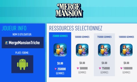 Vous êtes un joueur de Merge Mansion ? Vous cherchez un outil de Merge Mansion triche ? Certains des joueurs célèbres sur Merge Mansion ont beaucoup de Gemmes et Pieces. Ils peuvent acheter tout ce qu’ils veulent avec ces Gemmes et Pieces, mais pour un nouveau joueur ou un autre joueur qui n’a pas assez de Gemmes et Pieces, c’est vraiment triste. Les Gemmes et Pieces en Merge Mansion sont importantes. Si vous voulez être un joueur célèbre, vous devez avoir un personnage unique et un monde unique. Mais comment être un joueur célèbre si on n’a pas de Gemmes et Pieces ? Maintenant vous entrez dans le bon site pour obtenir beaucoup de Merge Mansion Gemmes et Pieces INSTANTANÉMENT !